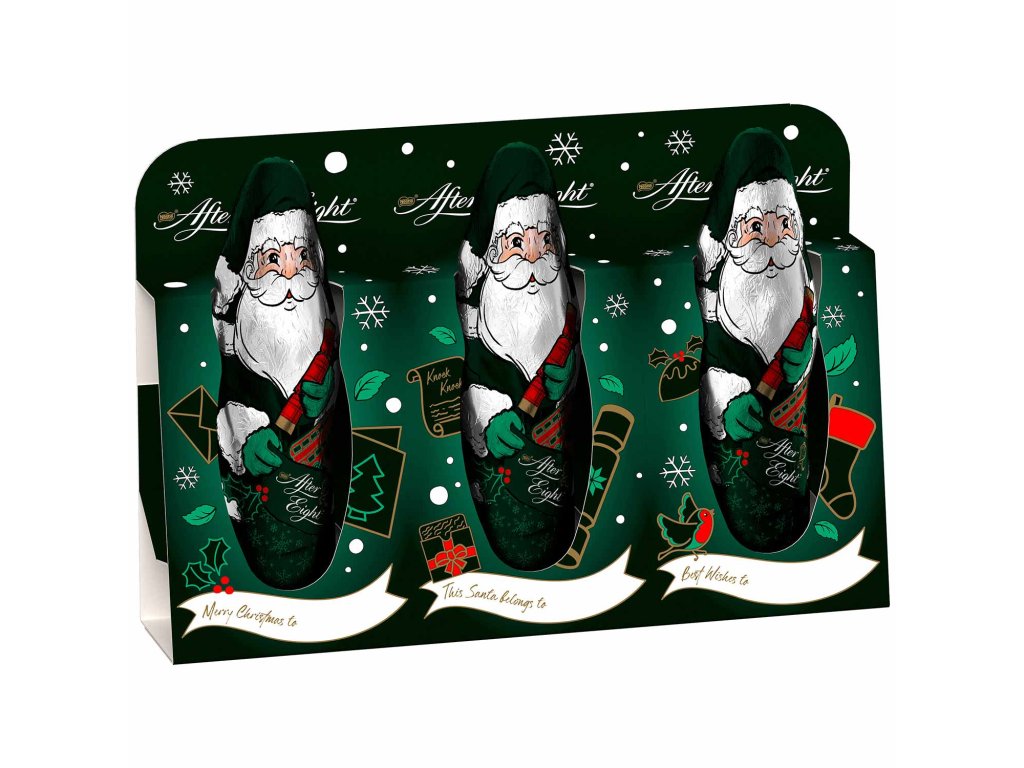 Jeśli kochasz After Eight, to trafiłeś w odpowiednie miejsce na święta z After Eight Mini Santas. Wydrążone figurki wykonane ze słynnej słodko-gorzkiej czekolady miętowej występują w zespołach po trzy sztuki i świetnie prezentują się na świątecznej tabliczce lub w pończosze Mikołaja.
