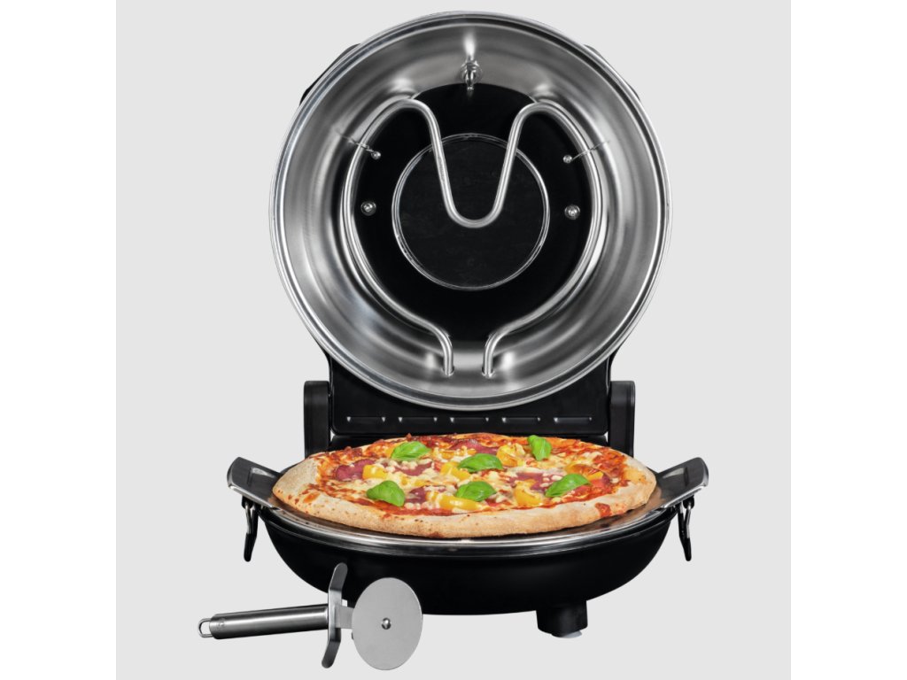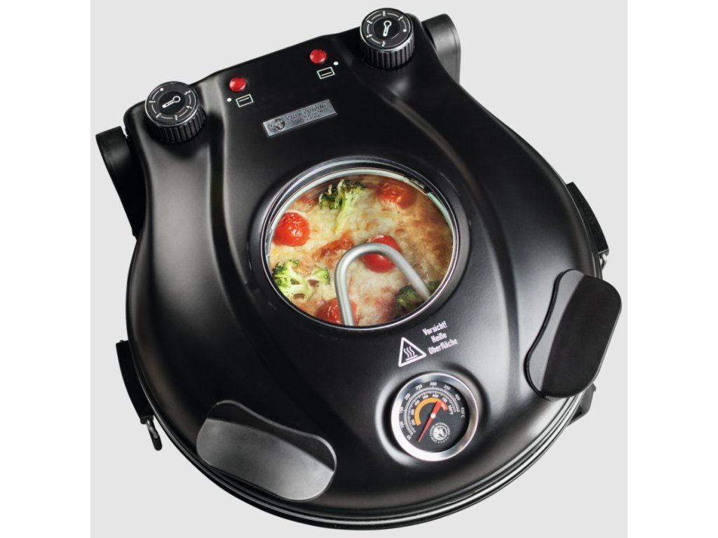Praktyczny: Wyjmowany kamień do pizzy ma średnicę 31 cm i jest wykonany z trwałej ceramiki, co zapewnia równomierne rozprowadzanie temperatury. Okienko kontrolne pozwala sprawdzić stopień wysmażenia bez utraty ciepła. Dzięki 50-milimetrowej szczelinie od cewki grzewczej patelnia do pizzy oferuje dużo miejsca nawet na pizze z obfitymi dodatkami.