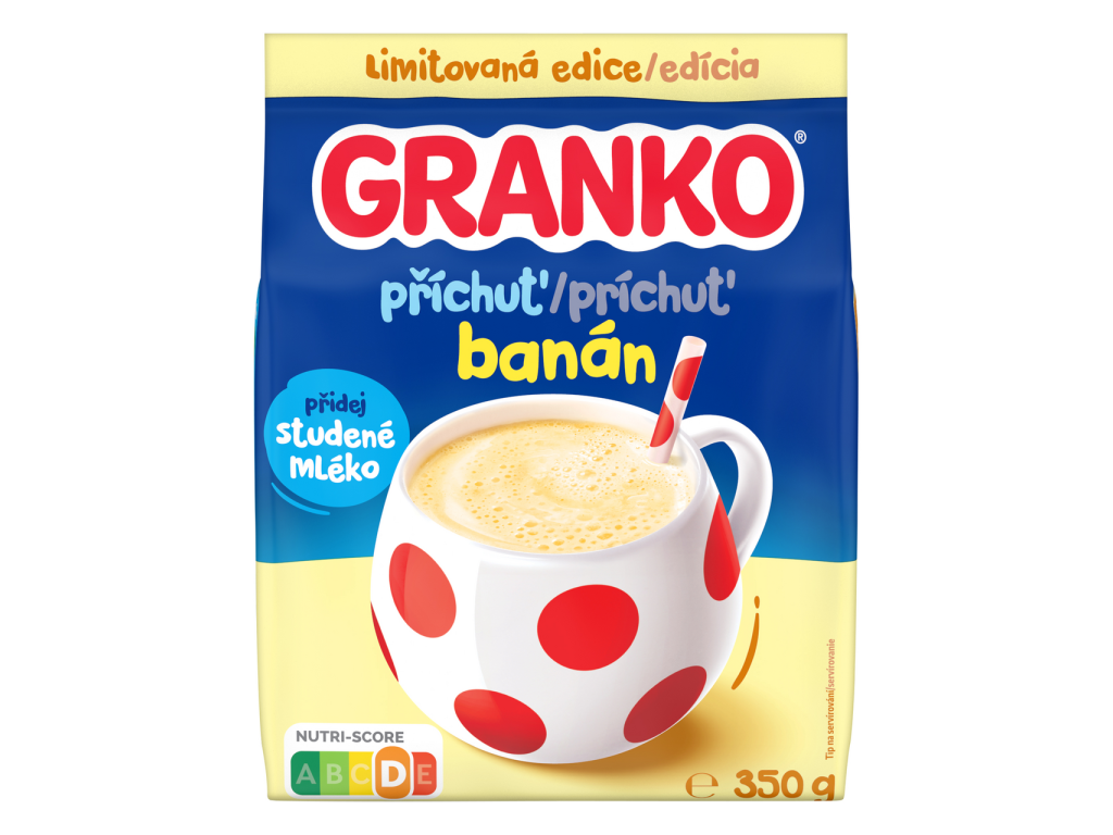 Sposób przygotowania: 5 łyżeczek Granko bananowego (13 g) + 200 ml półtłustego, zimnego mleka