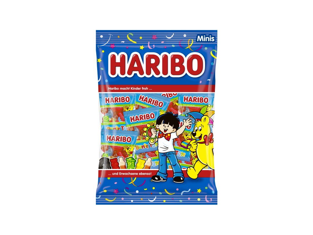 Mieszanka popularnych owocowych żelek Haribo pakowanych w małe torebki.