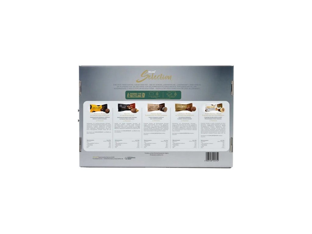 HELLMA Selection – w atrakcyjnym opakowaniu znajdziesz 40 porcji pięciu różnych rodzajów. Dzięki bogatemu wyborowi różnych wariantów smakowych, zaoferujesz klientowi wyjątkowo bogatą paletę smaków. Ta indywidualnie pakowana, pyszna i bezglutenowa mieszanka czekoladowa idealnie sprawdzi się w kawiarniach, gastronomii i hotelarstwie. Jako dodatek do filiżanki gorącego napoju lub jako prezent do pokoju hotelowego. HELLMA zachwyci serce.