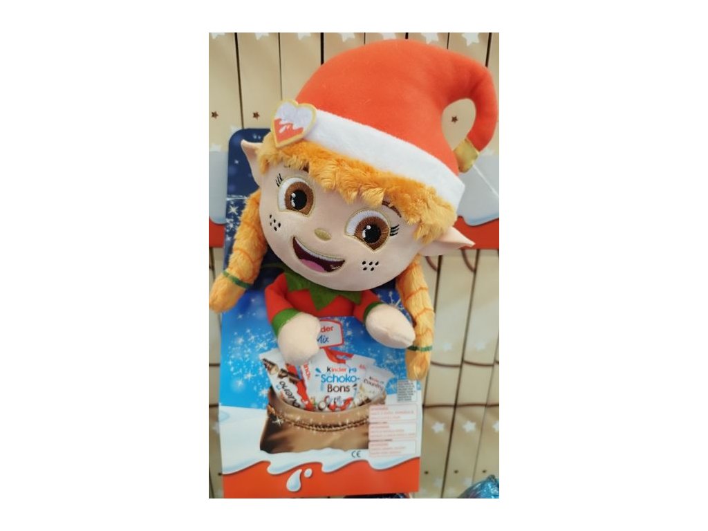 Popularne czekoladki Kinder Country, Kinder Schoko-Bons, Kinder Bueno oraz batonik Kinder w świątecznym opakowaniu z piękną pluszową zabawką pani Elf.