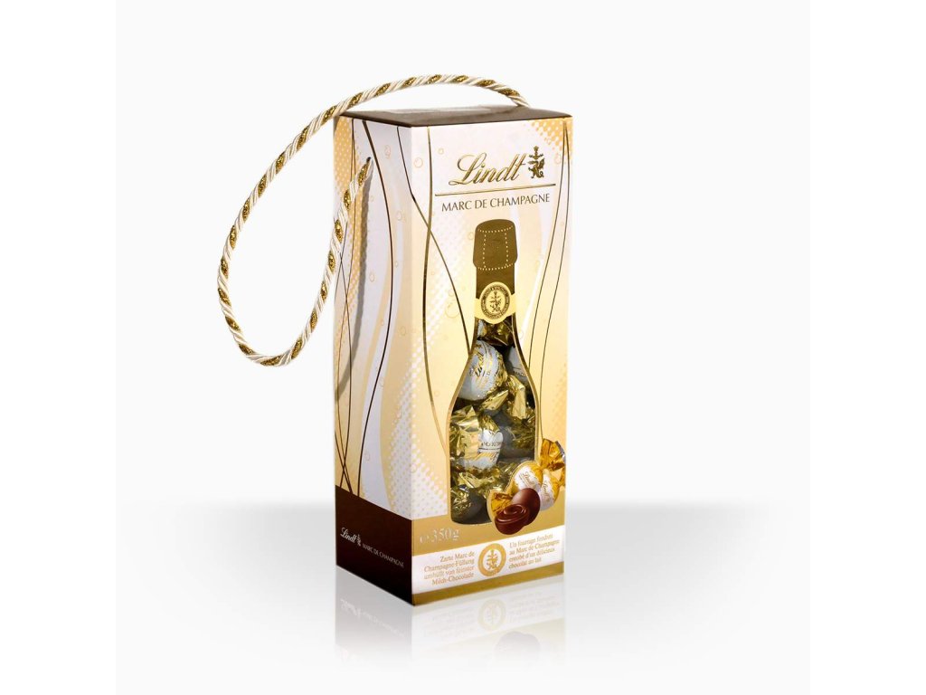 Pralinki Marc de Champagne w wyjątkowym świątecznym opakowaniu. Uformowany w butelkę i wypełniony kremową czekoladą