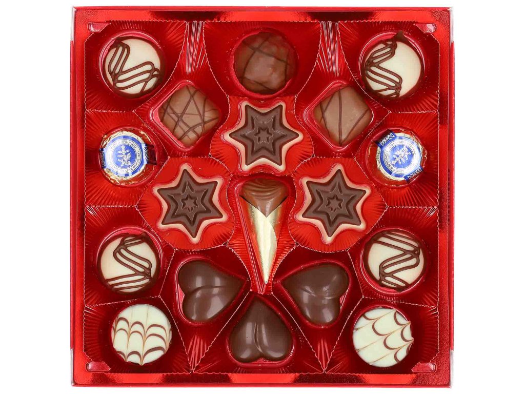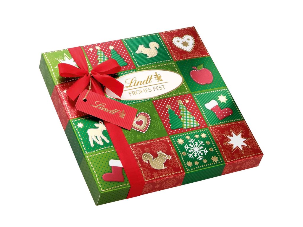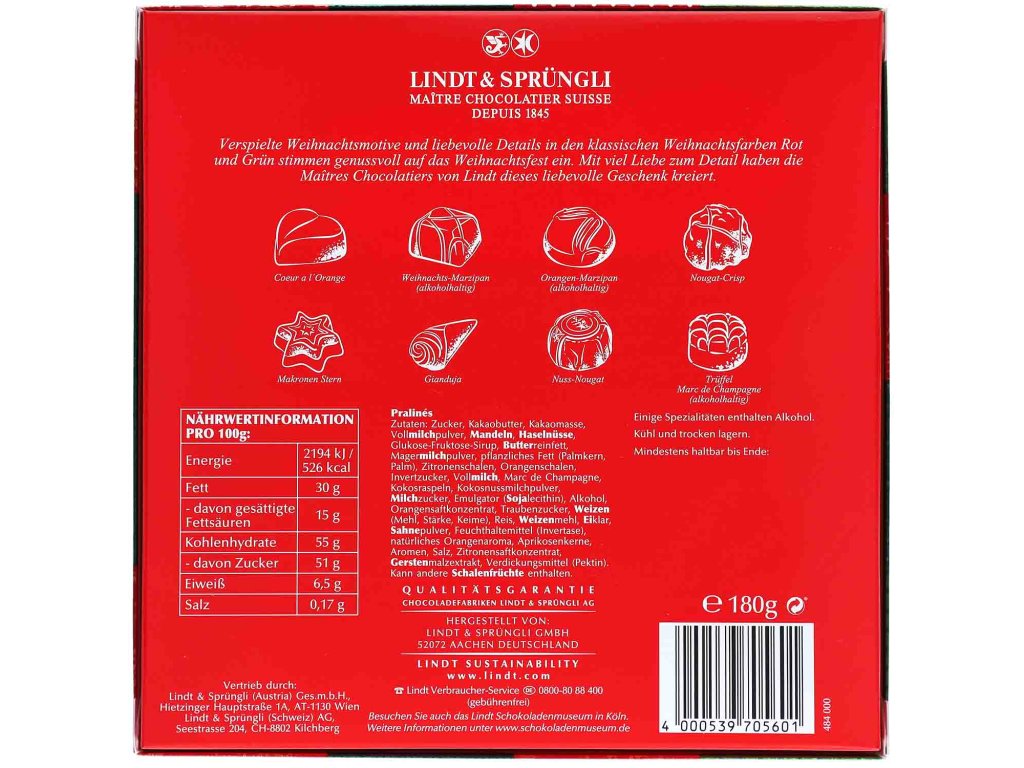 Czekoladki na święta. Zabawne motywy świąteczne i urocze detale w klasycznych świątecznych kolorach czerwieni i zieleni nadają pralinom Lindt Christmas odpowiedni świąteczny nastrój. Z wielką dbałością o szczegóły Mistrzowie Czekolady Lindt stworzyli ten uroczy prezent, w którym sprytnie złożone praliny rozpalą serca smakoszy. Na kartce można napisać, kto powinien otrzymać ten pyszny prezent. Świąteczne praliny Lindt oferują następujące smaki: Cœur i l'Orange, Świąteczny marcepan (zawiera alkohol), pMarcepan pomarańczowy (zawiera alkohol), nChrupek Ugat, mgwiazda żołędziowa, Gianduja, nugat orzechowy, lMarc de Champagne (alkoholik). To pudełko prezentowe o wymiarach ok. 18,5×18,5 cm z czerwoną kokardką i kartką do dedykacji.