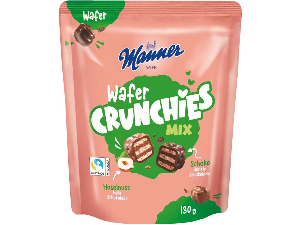 Chrupiące kawałki wafli z kremowym środkiem. Mieszanka wafli Manner łączy w sobie dwa nieodparte warianty w jednej torebce: lekkie wafle z delikatnym kremem orzechowym w mlecznej czekoladzie oraz gorzkie wafle kakaowe z delikatnym kremem kakaowym w czekoladzie. Małe kostki są praktyczne, chrupiące i czekoladowe – harmonijne połączenie tekstury i smaku.