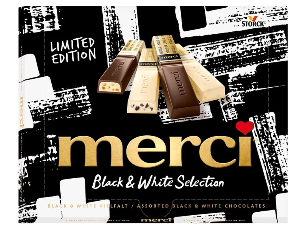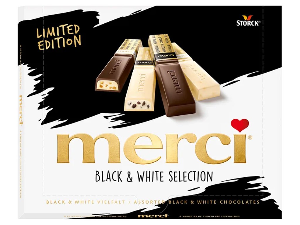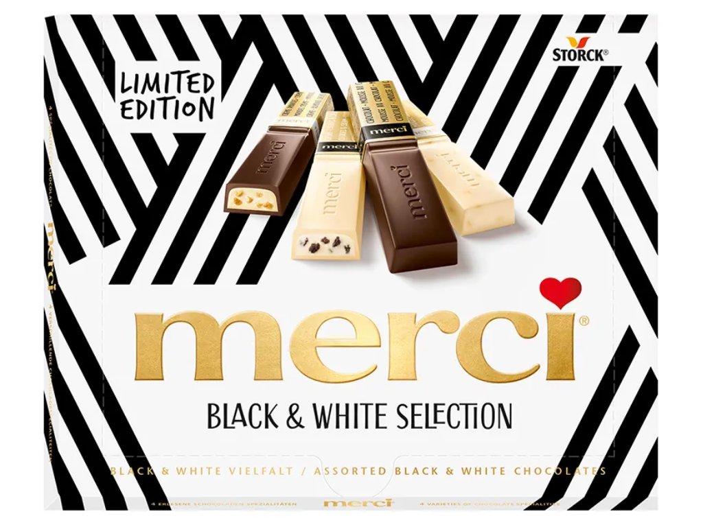 Ekskluzywna limitowana edycja ulubionej przez wszystkich czekolady Merci. Spróbuj 4 różnych odmian w edycji Black & White. Delektuj się delikatną ciemną czekoladą z kremem migdałowym lub musem kakaowym. A w wersji białej z chrupiącymi ciemnymi herbatnikami lub z kawałkami prażonych migdałów i chrupkami ryżowymi.