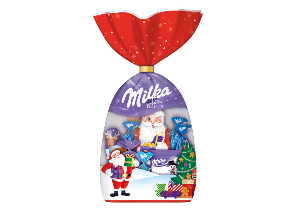 Mieszanka figurek bożonarodzeniowych z alpejskiej mlecznej czekolady i pojedynczo pakowanych kulek i batoników z alpejskiej mlecznej czekolady z alpejskiej mlecznej czekolady z nadzieniem mlecznym i obsypane drażetkami.