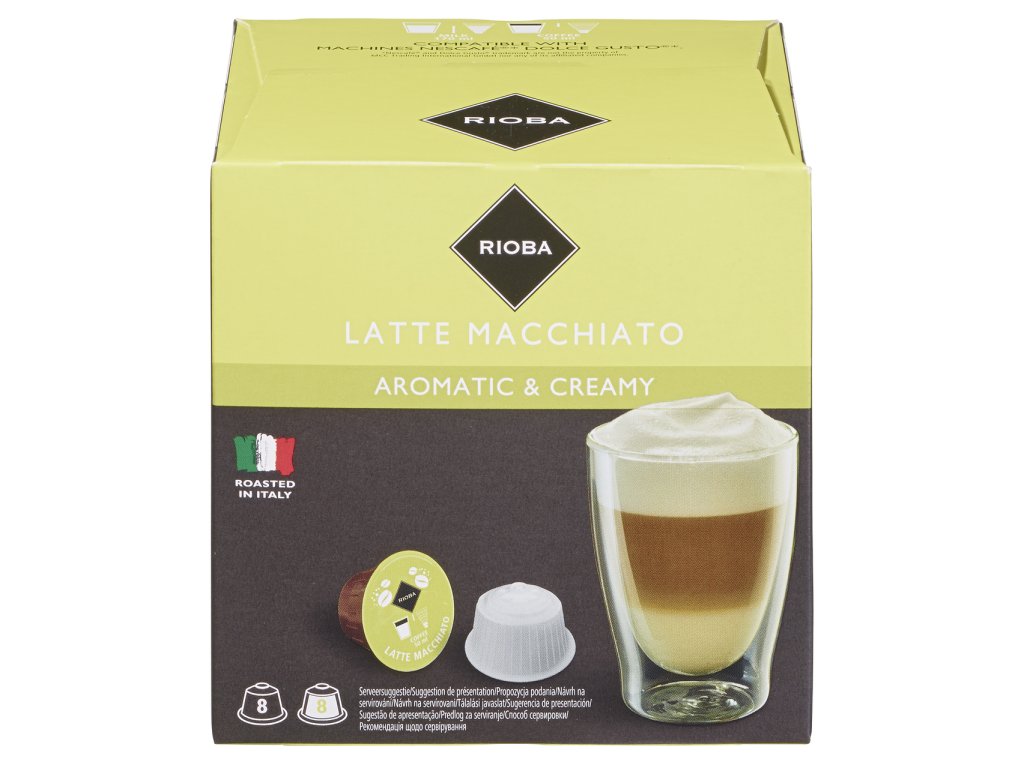 Mielona, palona kawa z odtłuszczonym mlekiem w proszku i cukrem w kapsułkach - 70% Arabica - 30% Robusta.