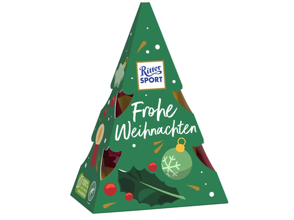 Choinka wypełniona jest 7 pysznymi czekoladowymi kostkami o smaku Schoko Crisp i Mousse au Chocolat.