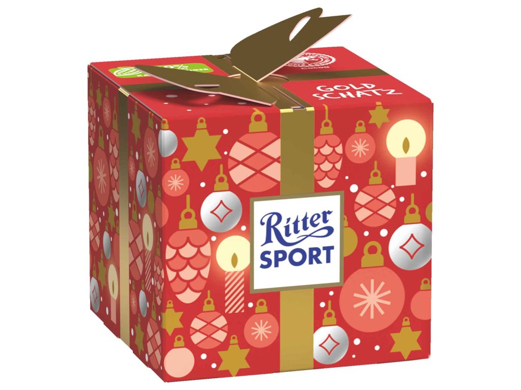 Kwadratowe dekoracje na choinkę. Złota kostka choinkowa Ritter Sport Mini Christmas Tree Cube to dekoracyjna niespodzianka