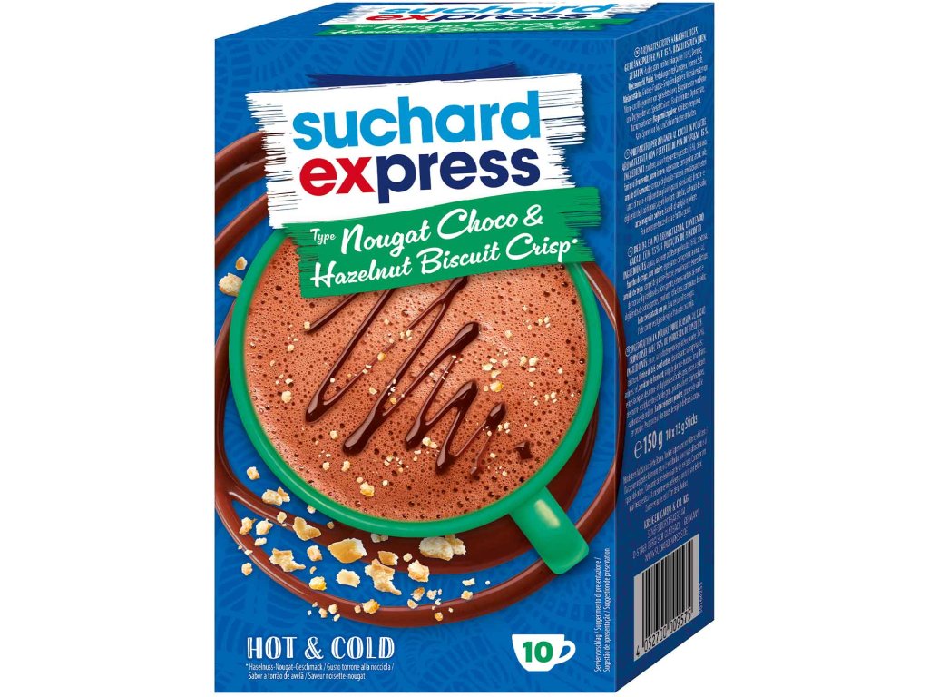 Suchard Express oferuje mieszankę instant do przygotowania gorącej czekolady o smaku orzechowo - ciasteczkowym.