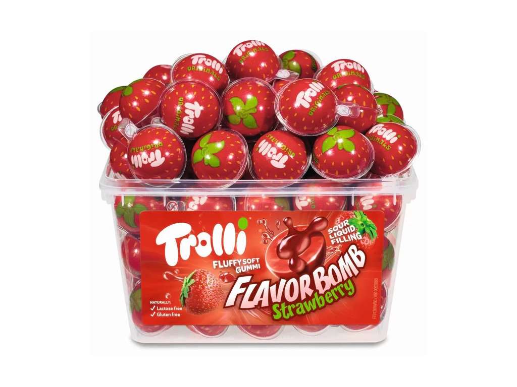 Trolli Flavor Bombs Strawberry to słodycz w formie puszystej piankowej skorupki z nadzieniem o smaku truskawki.