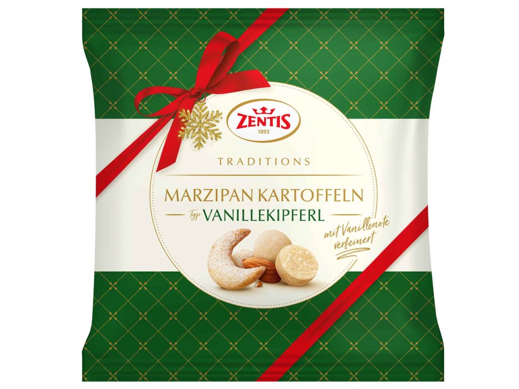 Zimowa uczta dla zmysłów - Zentis Marzipan Kartoffeln Vanillekipferl. Ziemniaczki marcepanowe o smaku rogalików waniliowych. Zentis Marzipankartoffeln to wyjątkowa propozycja dla wszystkich miłośników marcepanu i aromatycznych, świątecznych smaków. Klasyczne kulki marcepanowe, przypominające ziemniaczki (kartoffeln), zostały wzbogacone o waniliowy smak przypominający kruche ciasteczka waniliowe. To połączenie delikatności migdałów i aromatycznych przypraw tworzy wyśmienitą kompozycję, która doskonale wprowadza w świąteczny nastrój.